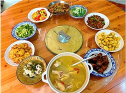 客棧特色美食有:棍子魚干,火腿肉煲,陳蹄豆腐煲,千島湖魚頭煲,暖窩(湯盆),炒肉圓子,辣椒炒火腿,干菜玉米餅,筍干老鴨煲,土雞煲等。