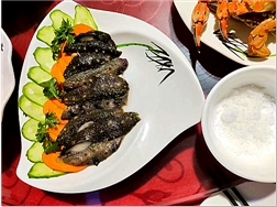漁家特色菜有:鮑魚、大蝦、海膽、、螃蟹、海螺、扇貝、海蠣子、海虹、石斑魚、鲅魚、鱸魚、章魚(八爪魚)、烏賊(墨斗魚)等。